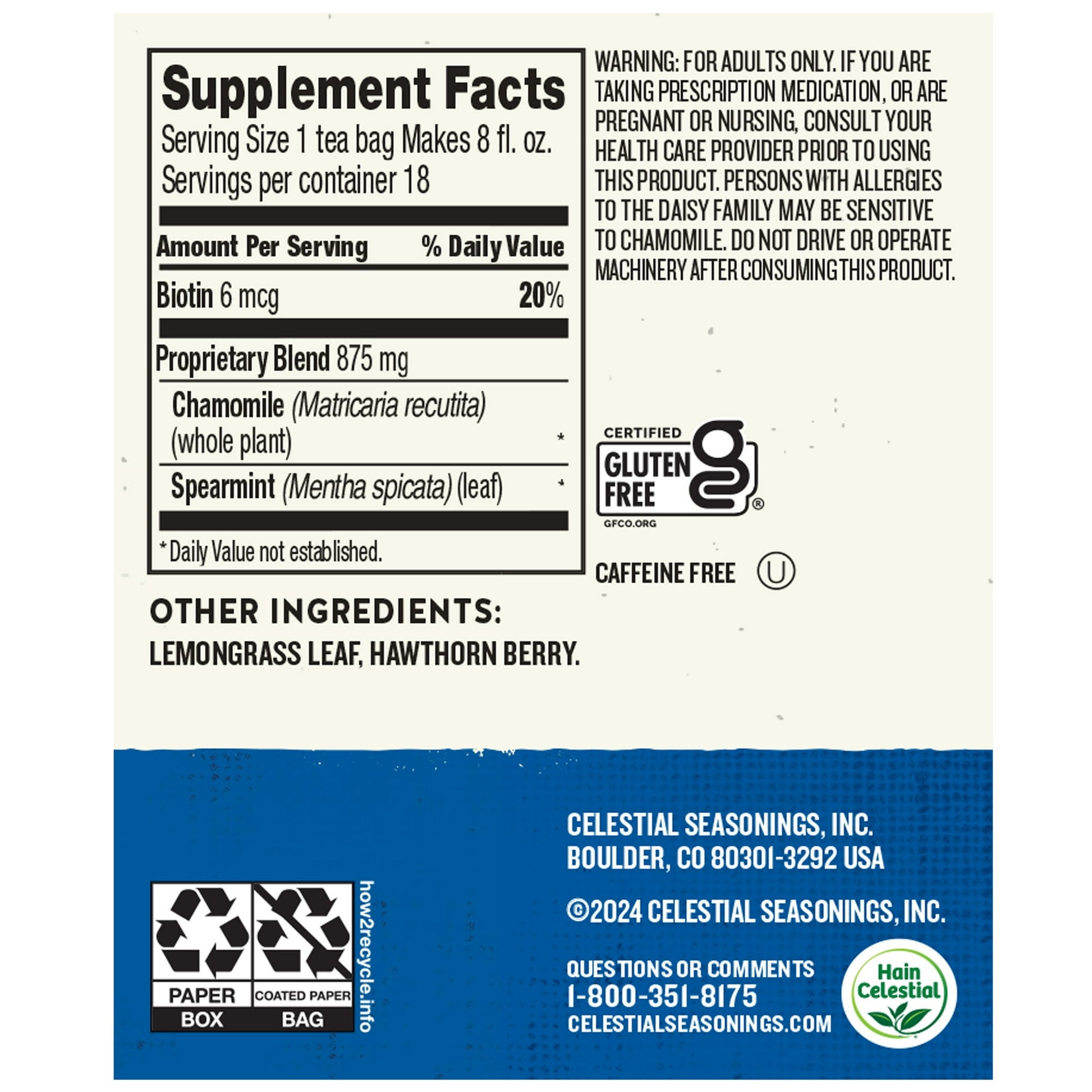 This relaxing caffeine-free tea starts with the beloved Sleepytime blend of soothing chamomile and spearmint. We then add biotin (vitamin B7) to help complement your self-care routine. More than 50 years ago, we created a truly soothing herbal tea to help folks wind down the day. We named it Sleepytime tea and it quickly became everyone’s favorite bedtime tea. Today our calming Sleepytime blend of botanicals is available in herbal, decaf green and wellness teas, so you can always find the perfect cup for your bedtime routine. When we started Celestial Seasonings in 1969, we were inspired by the awesome power of nature right outside our door in the Rocky Mountains. We foraged the fields and forests for herbs and botanicals, creating unique & delicious blends as America’s first herbal tea company. Today we’re still crafting tea in Boulder, Colorado under the watchful eye of our Blendmaster, creating teas that are bursting with benefits, flavor, and our passion for inspiring a happier and healthier life.
