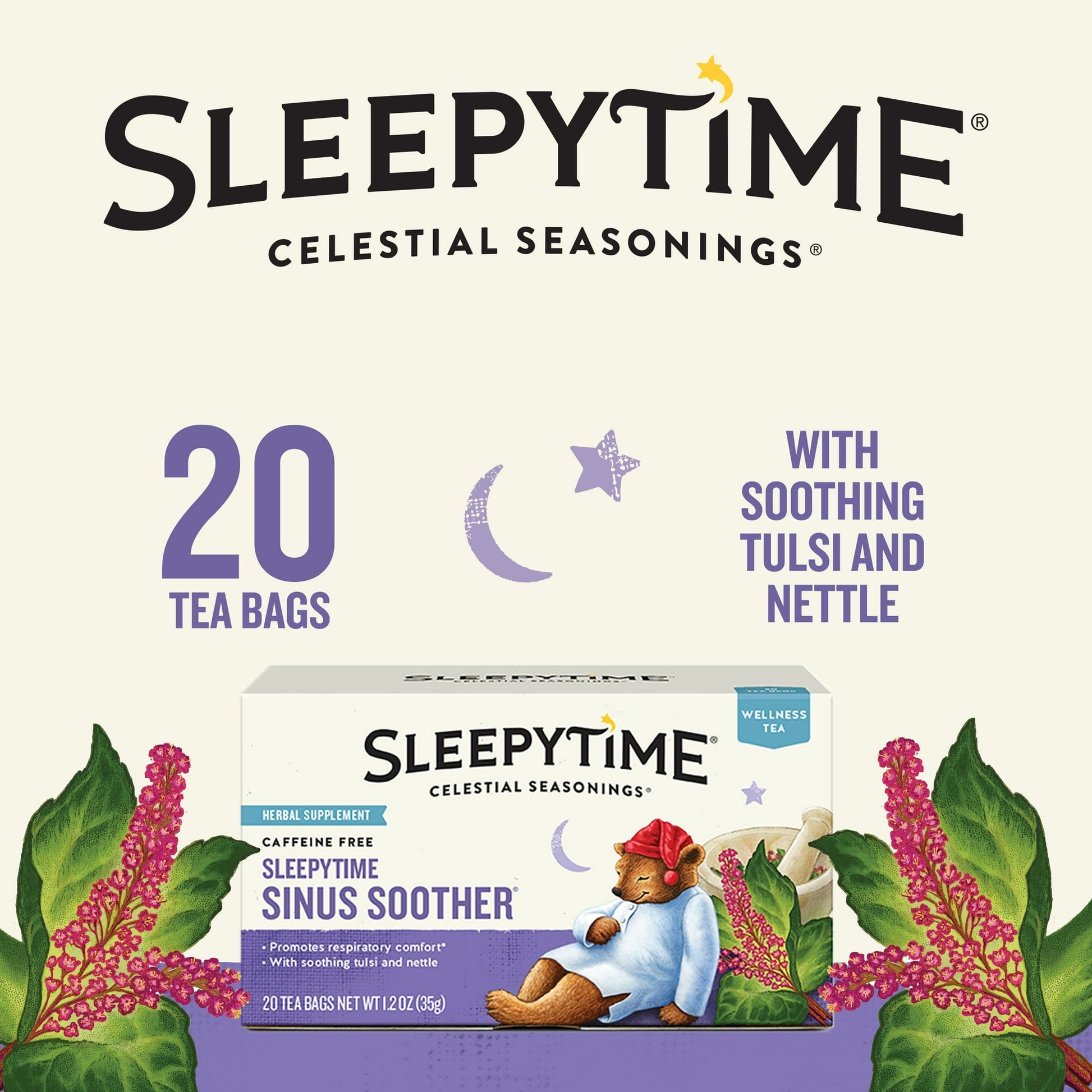Nothing is more soothing than a cup of your favorite tea. Celestial Seasonings Sleepytime Wellness Sinus Soother Tea is the perfect caffeine free addition to your nighttime routine. Plus, we added tulsi to help promote respiratory comfort and stinging nettle to cool and comfort the senses. Put some magic in your mug and enjoy the goodness found in every cup of Celestial Seasonings Teas. Celestial Seasonings teas are an invitation to put some magic in your mug! More than 40 years ago, we created a truly soothing herbal tea to help folks wind down the day. We named it Sleepytime, and it quickly became a favorite bedtime tea. Today, our calming Sleepytime blend of botanicals is available in herbal, decaf, green, and wellness teas, so you can always find a perfect cup for your bedtime routine.