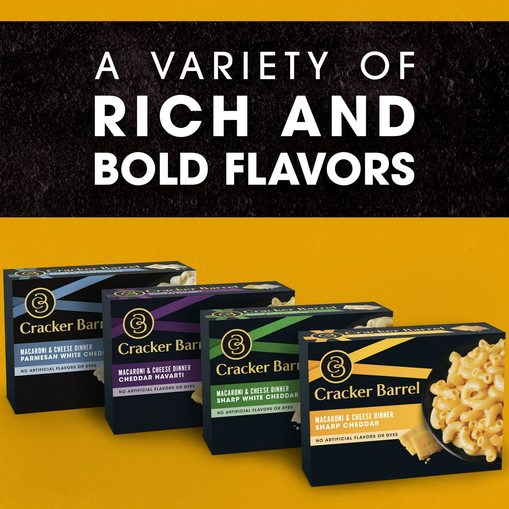 Enjoy the rich and bold cheddar taste of our Cracker Barrel Sharp Cheddar Macaroni & Cheese Box. Made with no artificial flavors or dyes, our famous mac and cheese is a savory dish that you can feel good about serving to your family. Our convenient boxed macaroni and cheese is ideal for enjoying on its own, combining with your choice of protein or veggies, or simply serving as a side dish with your main entree. Mac and cheese dinner is easy to prepare – just boil water, add pasta and cook until tender, then stir in cheese sauce packet and enjoy. Each 14 ounce box makes about four servings. The difference is in the cheese with smooth and creamy Cracker Barrel Macaroni and Cheese. Shelf-Stable and Fully Cooked.