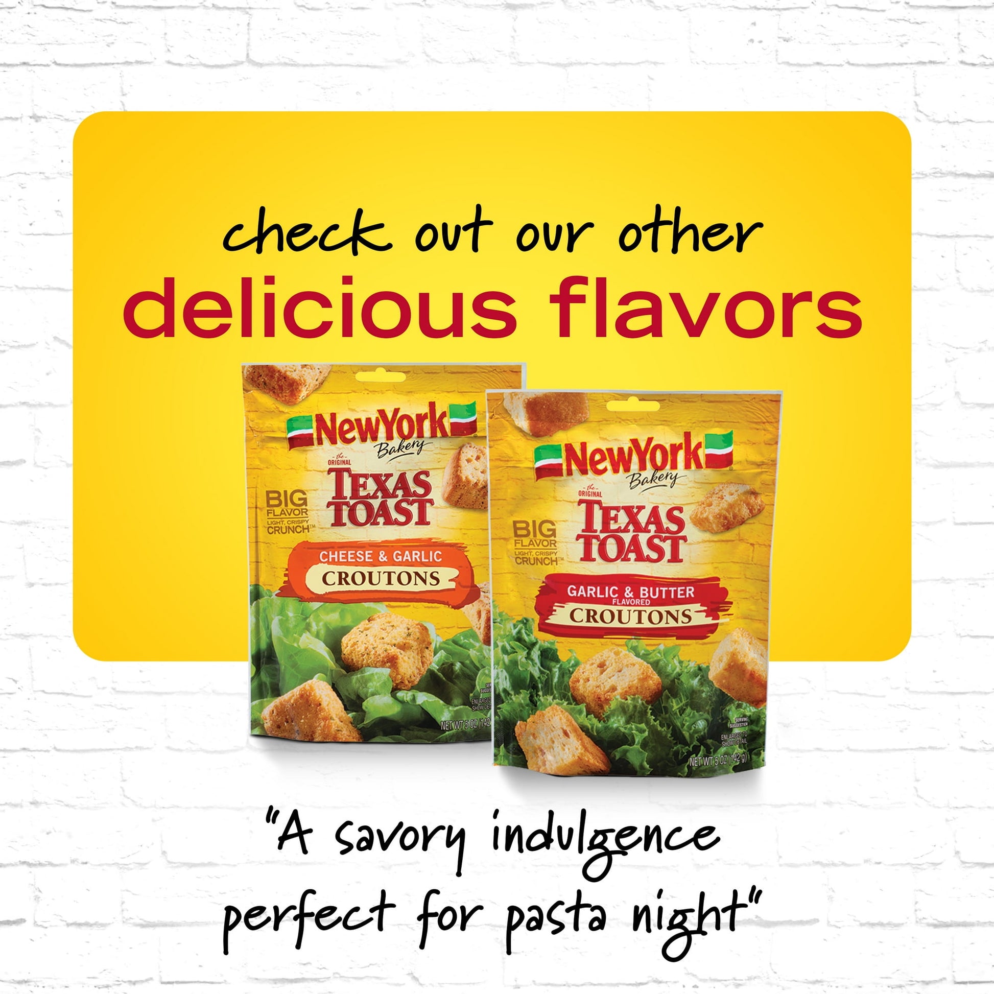 - NEW YORK BAKERY CHEESE AND GARLIC SALAD CROUTONS: Bring effortlessly rich flavor to your favorite salads and meals by adding our Texas Toast croutons made with garlic and Romano cheese.