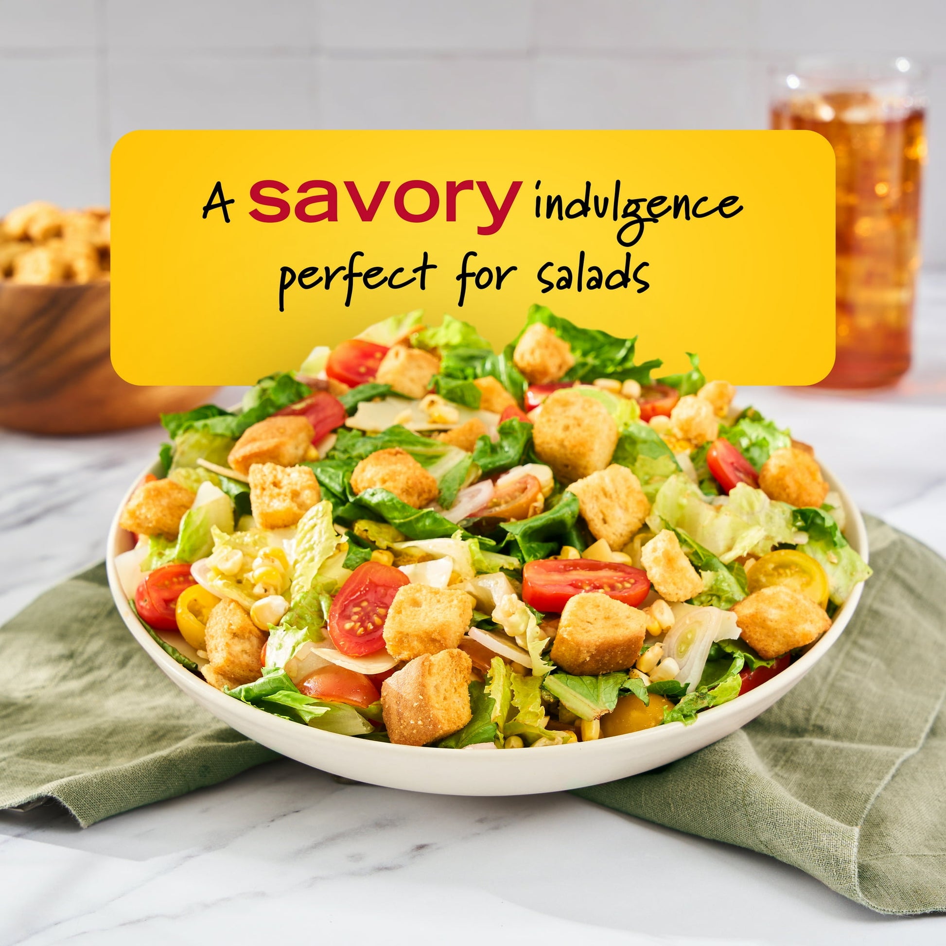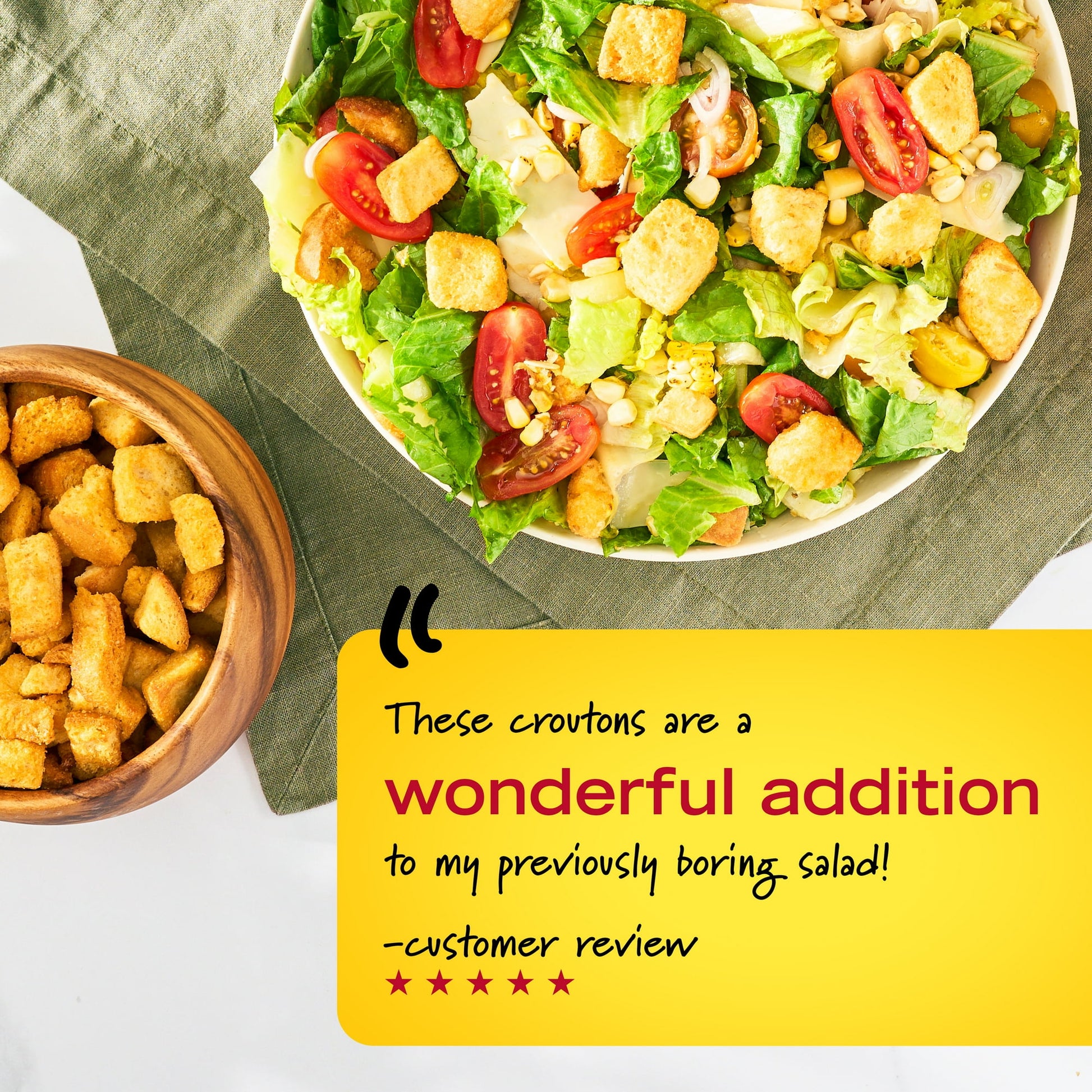 - ADD EXCITEMENT TO SALADS: Elevate your salad to a new level with a robust depth of flavor. Our large cut seasoned croutons pair perfectly with any salad that is in need of an upgrade.
