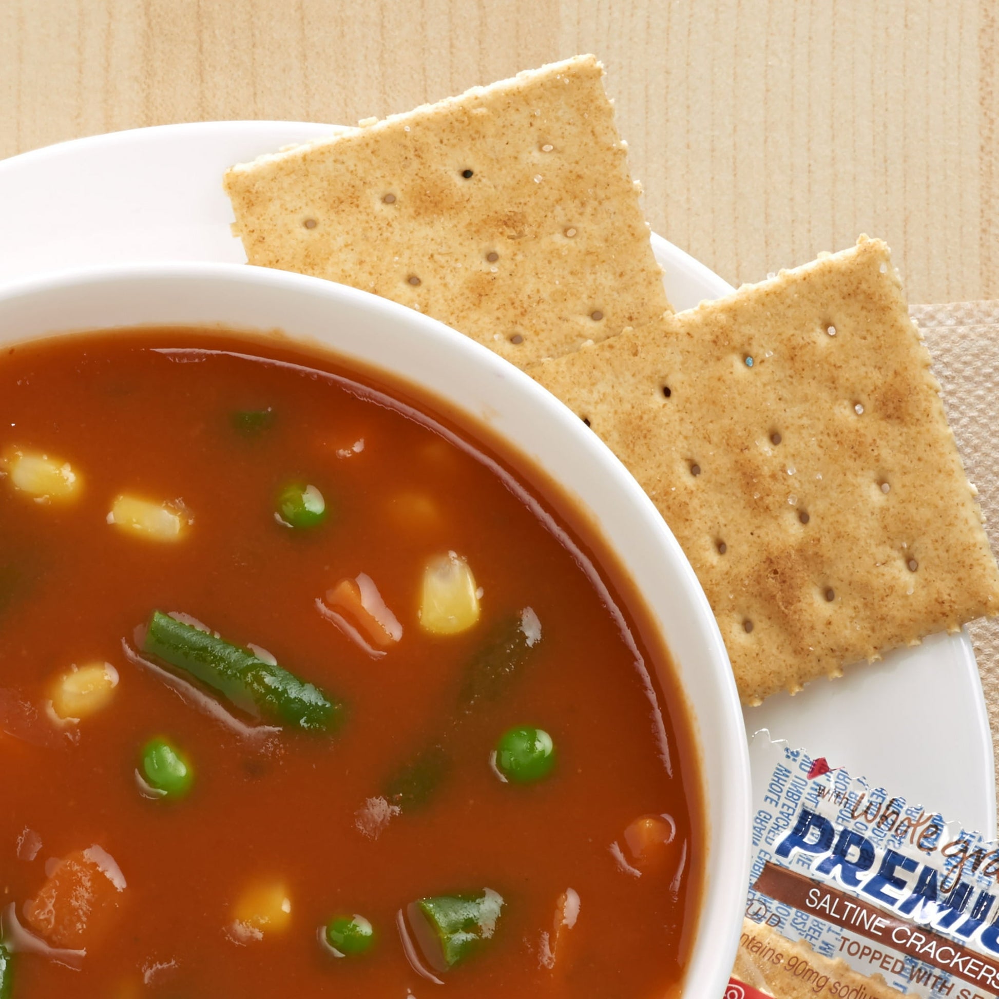 Premium Saltine Crackers with Whole Grain Wheat are time-tested and delicious. These soup crackers feature a light flavor and crispy texture with sea salt on top for the perfect salty touch and contain 5g of whole grain per 16 g serving (34% of grains are whole grains). Munch on these classic square snack crackers plain, or top them with cheese, peanut butter or dip as salty snacks. They're delicious crumbled into your favorite soup. Individual sleeves keep these bulk soda crackers fresh.