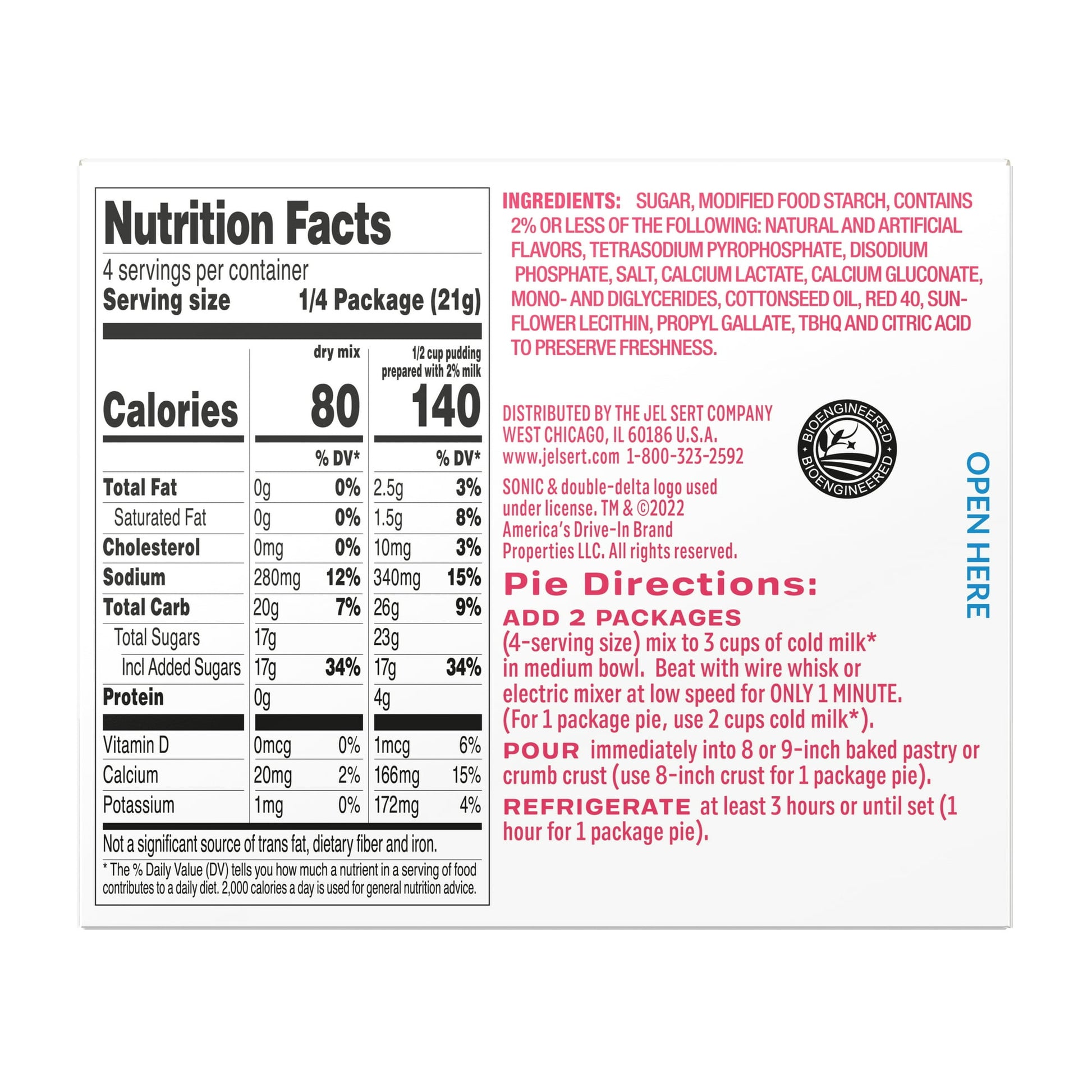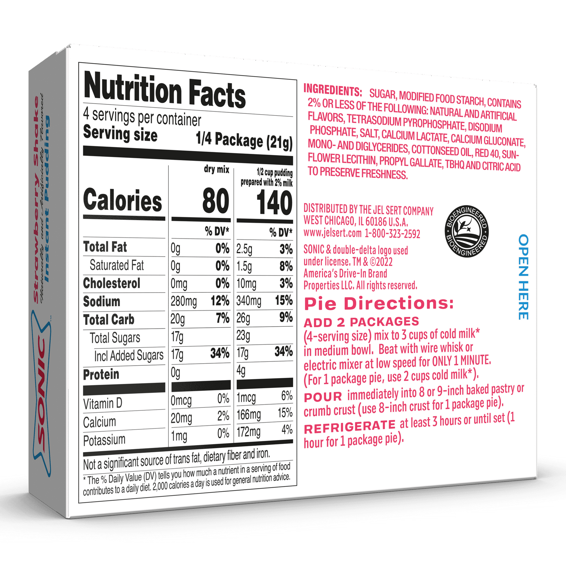 Sonic Instant Pudding is perfect for warm summer days or whenever you or your kiddos need a sweet treat. Sonic Strawberry Shake Pudding is delicious and fat-free with only 80 calories per serving. Perfect for after-school snacks, pool days, or picnics, this strawberry snack pudding is easy to prepare and snack on from the shelf-stable cardboard box. Prepare the instant pudding just like your childhood favorite Jello pudding snack. Add the pudding mix to two cups of cold milk, beat with a whisk or a mixer for two minutes, pour into a dish, and refrigerate until firm and ready to eat. Enjoy your favorite Sonic Drive-In drinks in pudding form. The whole family will love Sonic Pudding Mix!