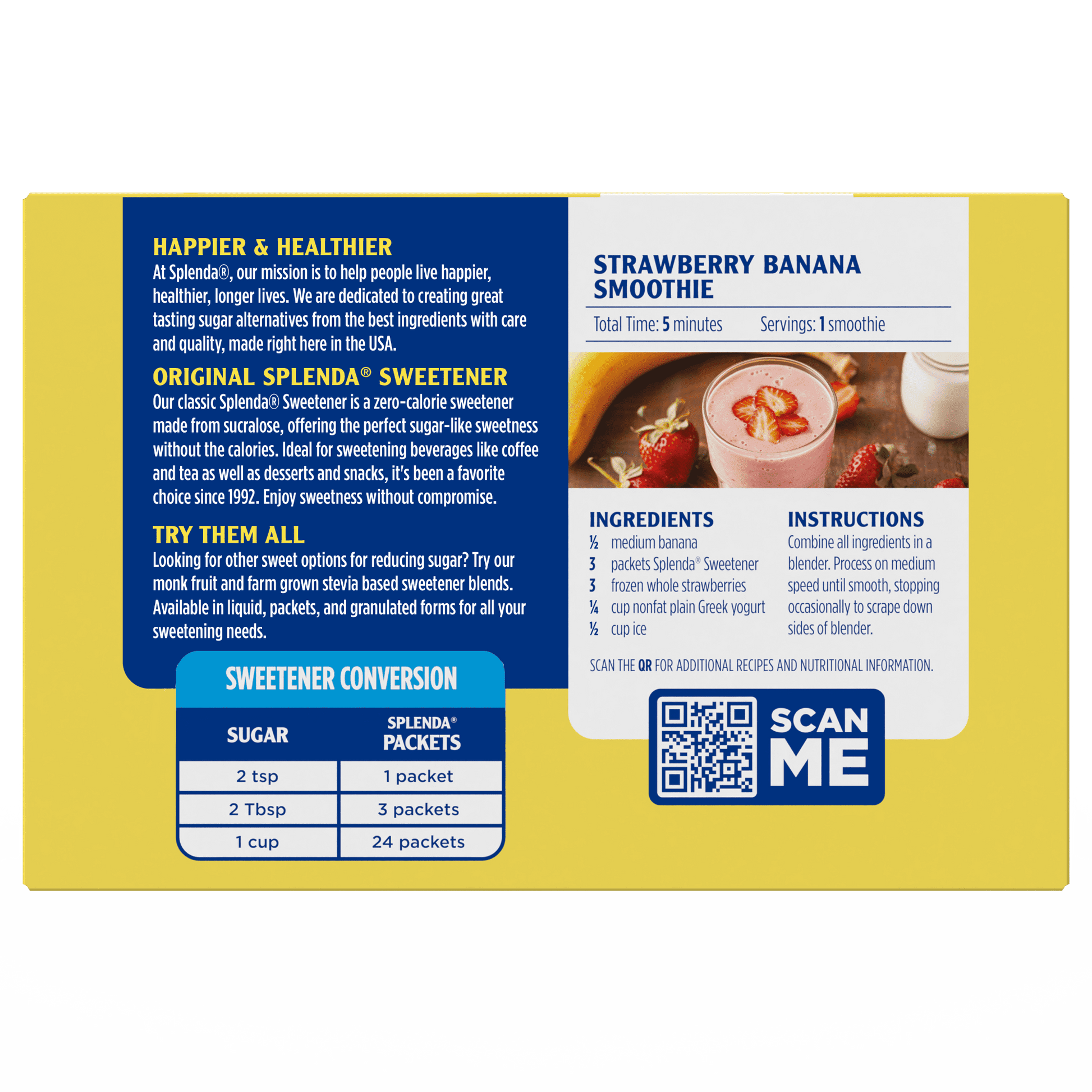 Sprinkle Sweetness! Splenda Zero Calorie Sweetener, Packets, are individual portions in the original yellow packets. They are a great way to sweeten beverages and can be sprinkled on cereal, fresh fruit, and more. Try Splenda Zero Calorie Sweetener Packets today, super easy and on-the-go ready for any trip and adventure that awaits. Visit Splenda.com for more information about this products and learn more about all the products we offer as well as recipes to mix and match our products with!