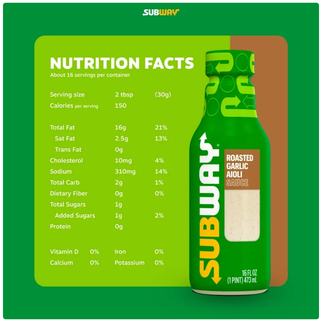 - REFRESH YOUR CONDIMENT COLLECTION: Subway Roasted Garlic Aioli Sauce offers classic garlic seasoning and versatile use. Enjoy our rich, savory sauce as a dip, marinade, dressing and more.