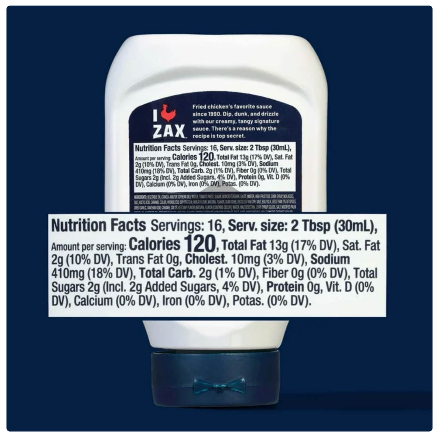 At Zaxby's, sauce is boss and our famous Zax Sauce isn't afraid to take charge. Smoky, creamy, and packed with pepper, the sauce-abilities are endless; dunk, dip, or drizzle the condiment on any fingerz, wingz, and sandwiches for an unforgettable flavor. The product comes in a resealable bottle to zaximize its taste. With a classic flavor you'll want to savor, Zax Sauce is for all y'all.